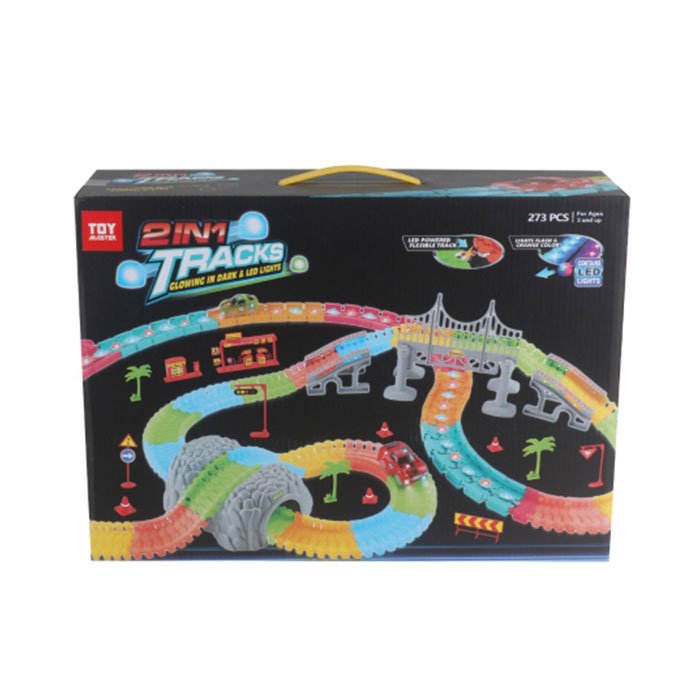 This 273-pieces Magic Tracks Set great for everyone aged 3 and up! Each set includes 2 LED light-up race cars, 1 LED power base, 2 compatibility, 48 LED track Piece, and 208 glowing track Piece, 4 tree Piece, 1 traffic piece, 1 mountain tunnel, 4 arch fittings, 1 bridge, and 1 sheet of peel n’ stick car decals!