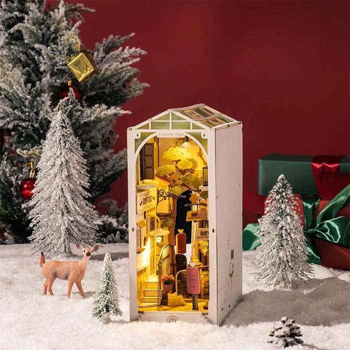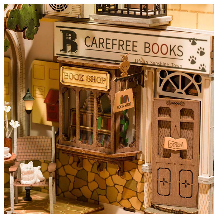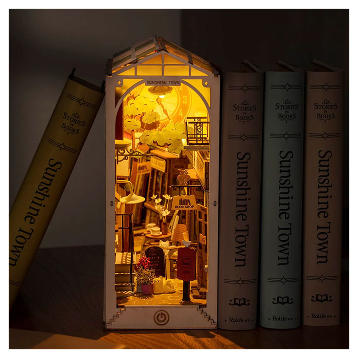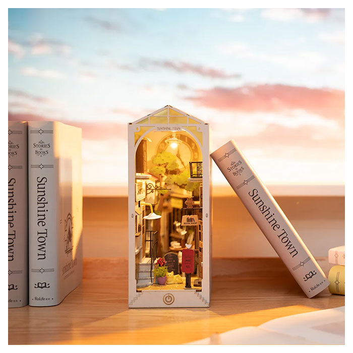 - Robotime – Rolife Sunshine Town Book Nook TGB02 book nook is a creative 3D wooden DIY miniature house.