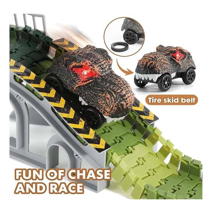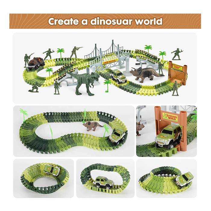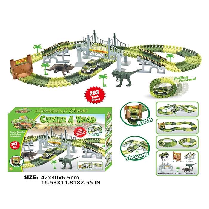Your child’s development through play as your toddler enjoys our slot race car dinosaur tracks he or she will also be practicing their motor skills and coordination, learning how to make all types of roads with the flexible tracks, developing hand-eye coordination, refining there motor skills and their problem-solving techniques too. As they grow older, and their skills have developed, they can still enjoy playing with our race car track dinosaur track set as it is so much fun! The Amazing Tracks Dinosaur World includes 142 pieces, including 1 battery operated military car, 2 dinosaurs, 4 trees, 2 slopes, 1 swing-door and 1 hanging bridge.