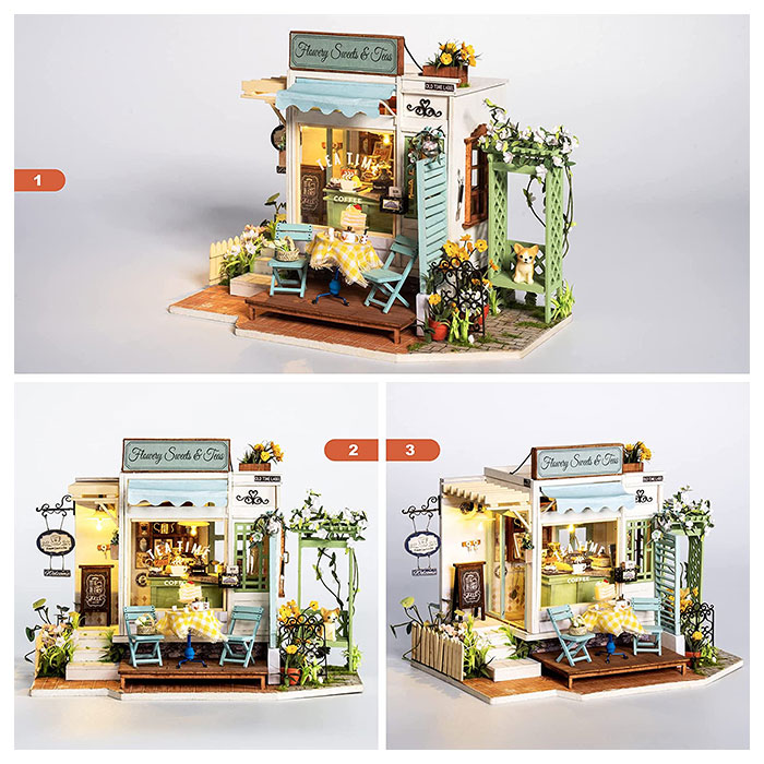 Rolife DIY Miniature Dollhouse kit Flowery Sweets & Teas captures a adorable corner of little shop. Crafting, stitching, painting, assembling. Make mini furnitures with your own hands. You will have a relaxing time to finish an art work!