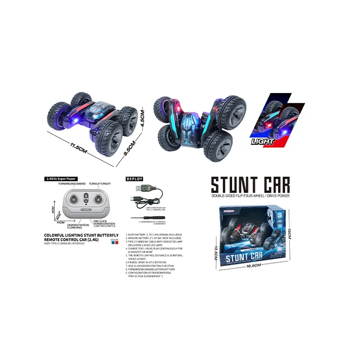 Perform flips and stunts with the RC Mini Stunt Car Double Side! Features 7-color LED lights and a rechargeable lithium battery; remote requires 3×AA batteries (not included).