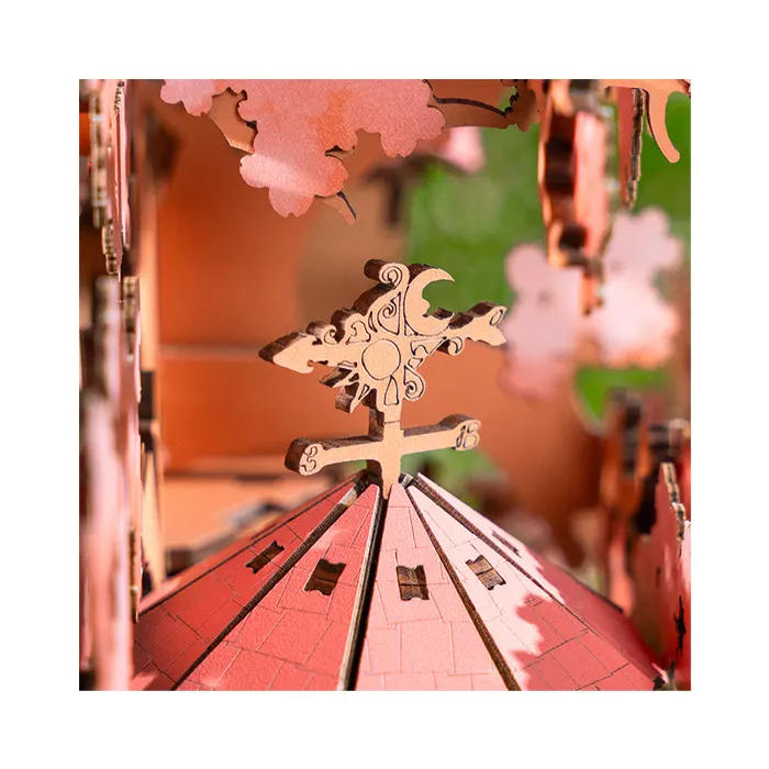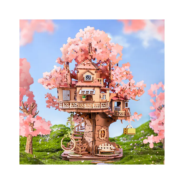 This 3D wooden puzzle is a breathtakingly detailed fairytale tree house nestled under the canopy of pink cherry blossoms.
