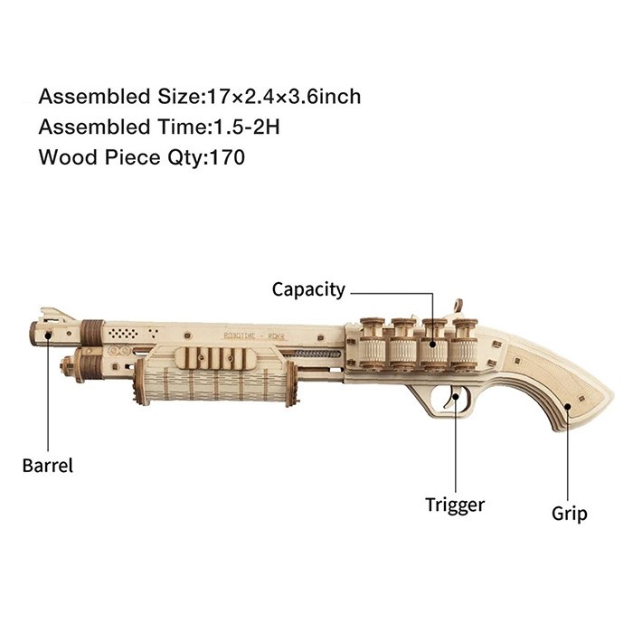 The ROKR Terminator M870 3D Puzzle is an intricate mechanical wooden puzzle with 170 pieces. It allows you to handcraft and assemble a detailed model of a Terminator M870 rubber band gun, combining creativity and engineering skills in one captivating activity.
