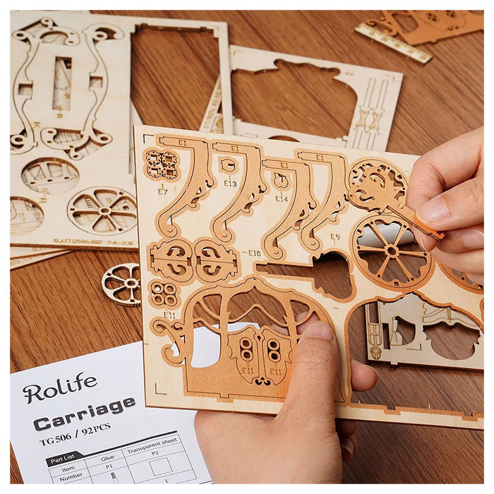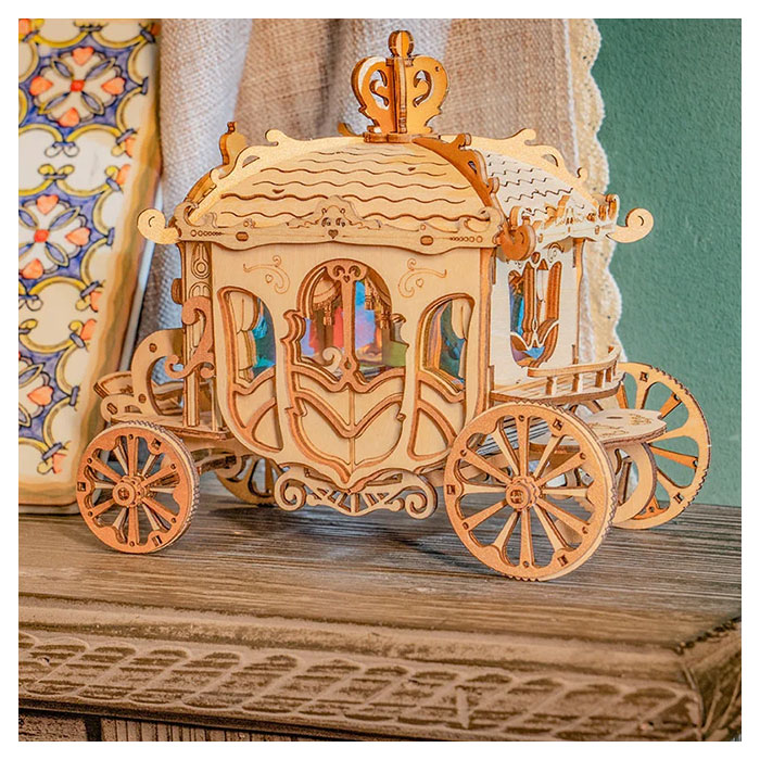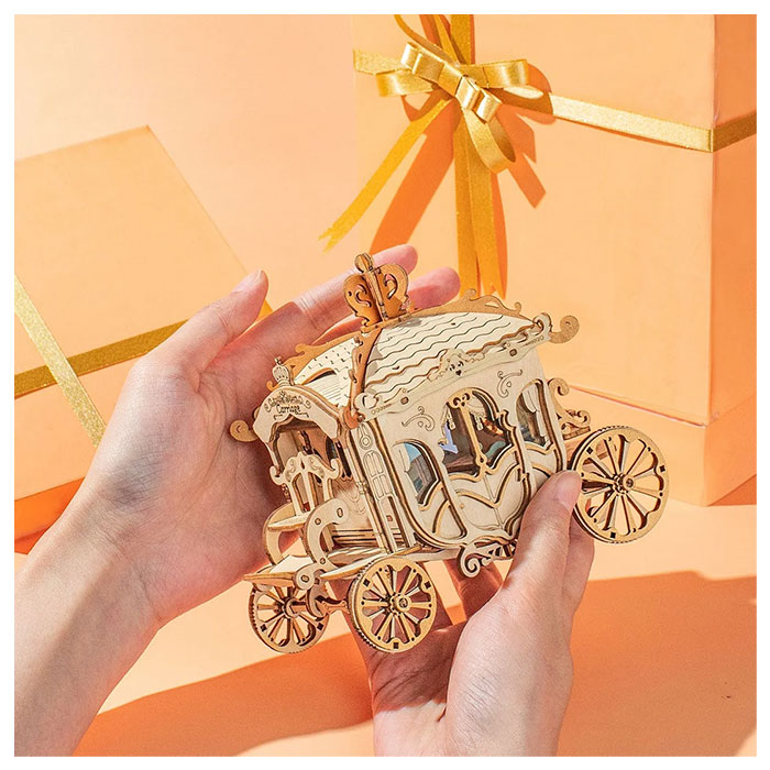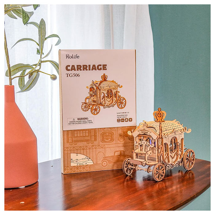 Rolife Classic Carriage TG506 – Modern 3D Wooden Puzzle. The scale model car features vivid details of superb coach, delicate windows, coachman seat, and a crown on top. It will bring you back to glorious mansion of old European scenes. Lovely display on shelf or desk. Vintage wooden model car kit you can build by yourself. Exquisite handcraft work for any antique car collection lover. The retro colors add special touch to the puzzles kit.