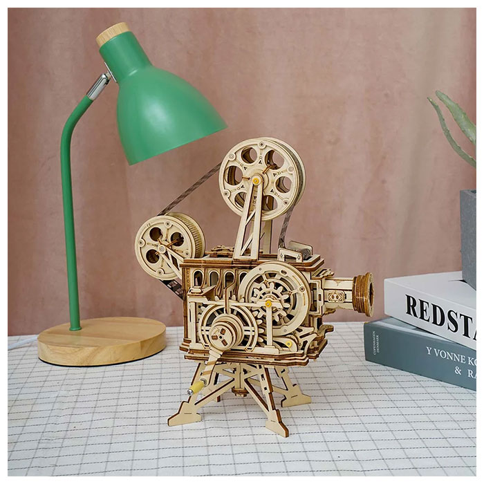 Return to the early days of movie-making with this clever vitascope design. This high-quality 3-D wooden puzzle has stylish, detailed design and mechanical gears. In a dark room, hold the toy and keep about 30cm to a whiteboard or wall, rotate the handle, and you will see the animation. The film that came in our package is a little Chaplin dance, and you can also use your own film. For ages 14+. Includes all pieces and instructions to create the model as shown.